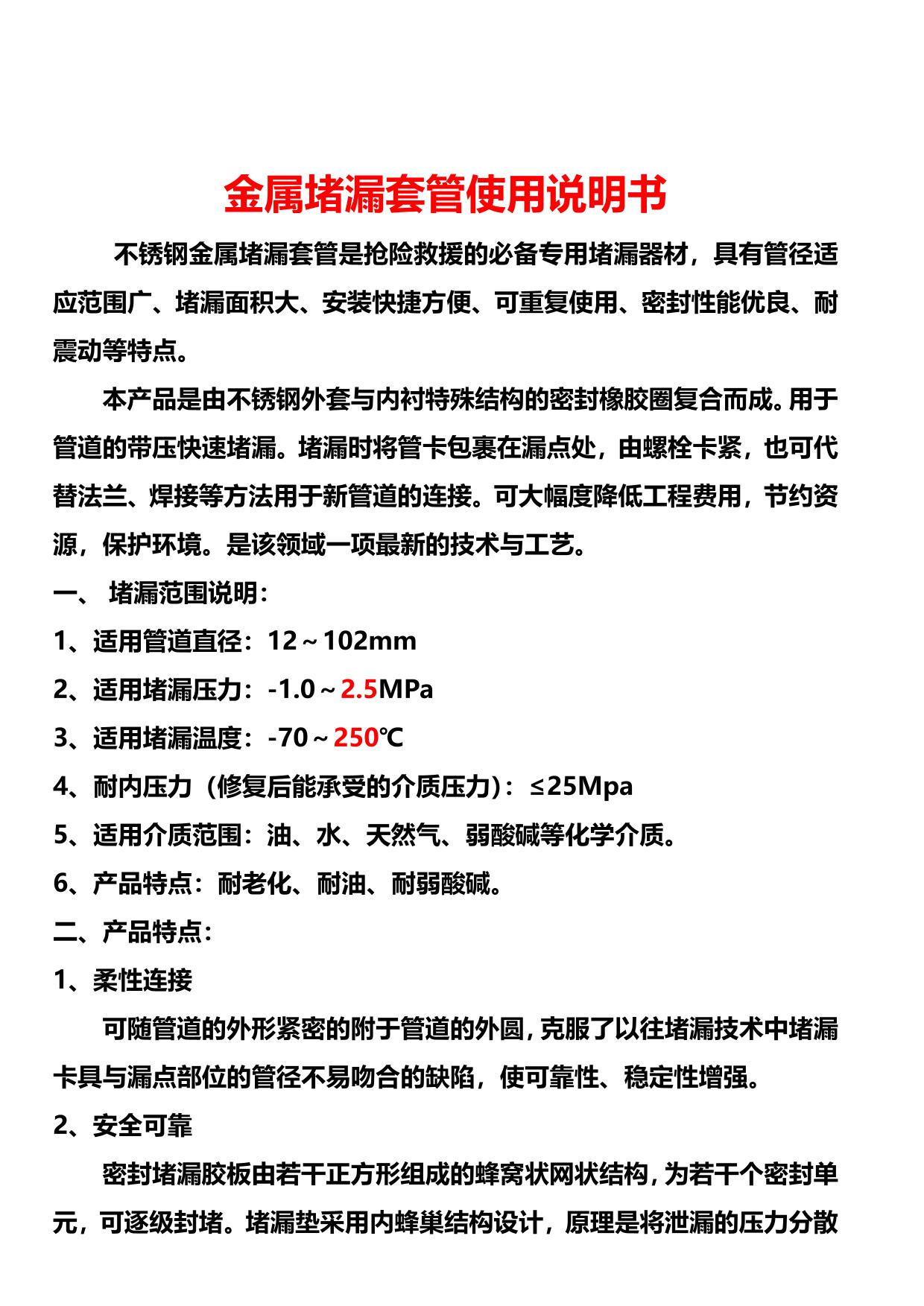 2、适用堵漏压力:-1.0~2.5MPa