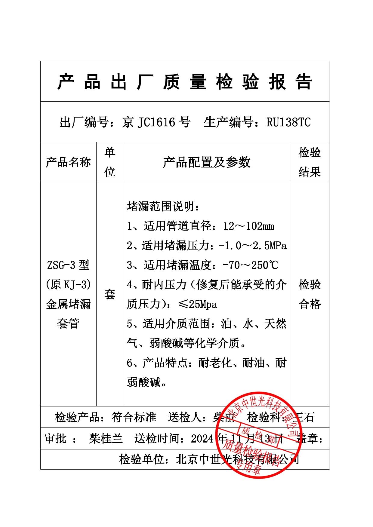 耐内压力(修 复后能承受的介质压力):≤20Mpa。