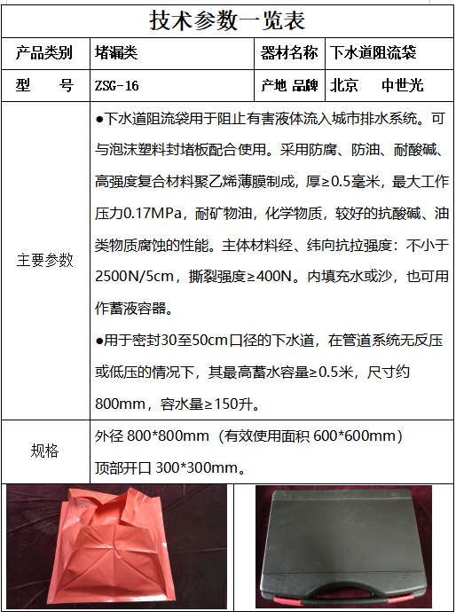 ●下水道阻流袋用于阻止有害液体流入城市排水系统。可与泡沫塑料封堵板配合使用。