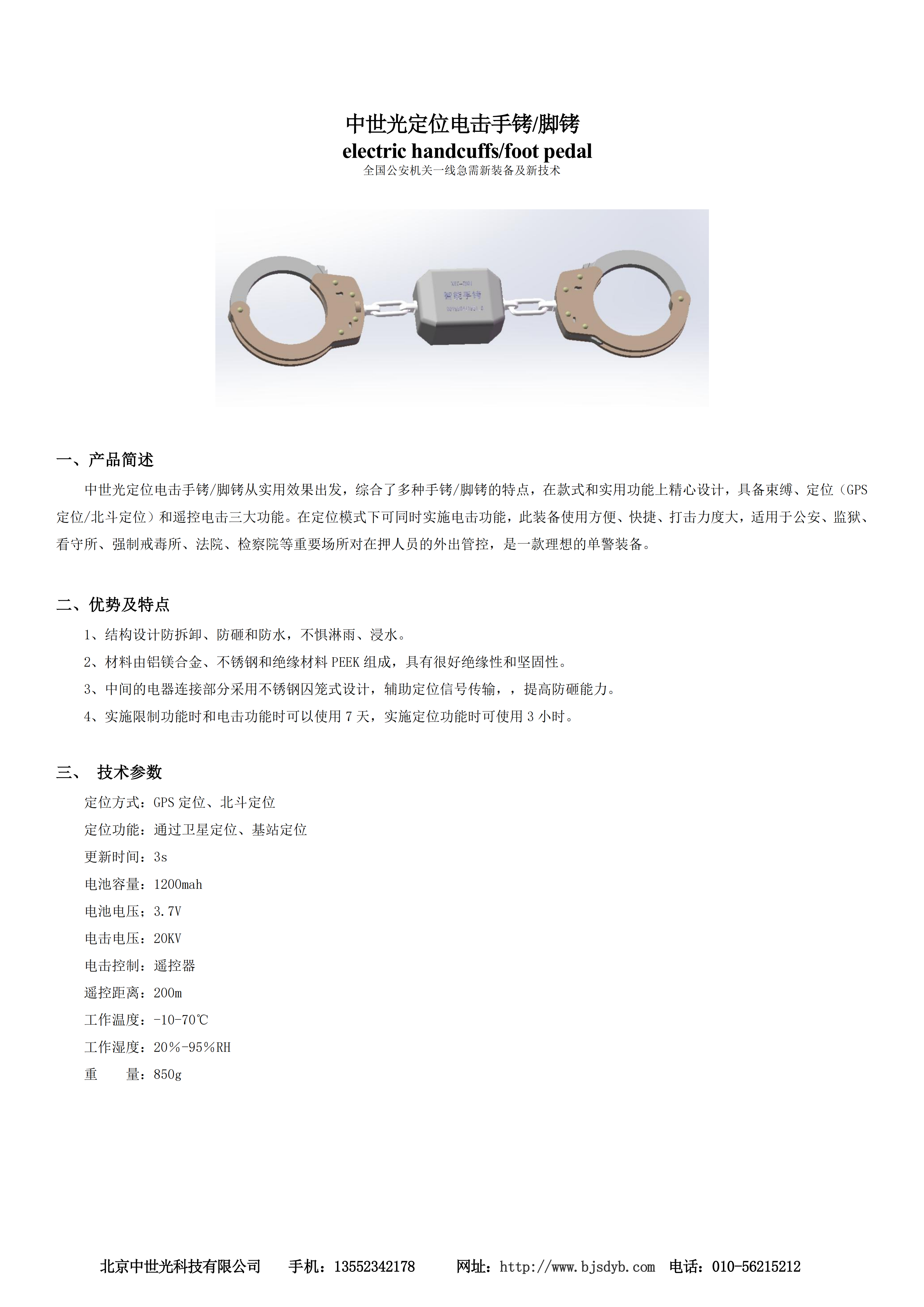 中世光定位电击手铐/脚铐从实用效果出发,综合了多种手铐/脚铐的特点,在款式和实用功能上精心设计,具备束缚、定位(GPS定位/北斗定位)和遥控电击三大功能。在定位模式下可同时实施电击功能,此装备使用方便、快捷、打击力度大,适用于公安、监狱、看守所、强制戒毒所、法院、检察院等重要场所对在押人员的外出管控,是一款理想的单警装备。