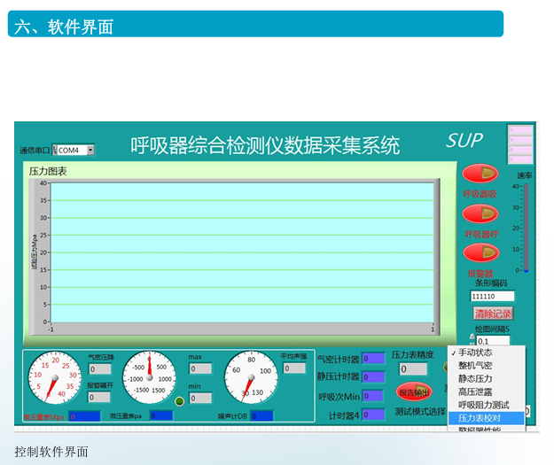 由电动机、波纹管和控制电路组成。波纹管的顶部有一个开口与试验头模的嘴相通,从计算机来的指令控制电动机运转。电动机通过连杆压缩或拉伸波纹管,从试验头模的嘴中吸入和呼出空气。人工肺有一个外壳,外壳前面板上有一个电源指示灯和一个电源开关,用于接通机内电源。外壳后面板有一个电源接口用于接入220V电源。有一个数据输入/输出接口用于人工肺与计算机之间的数据传输,有一个传感器接口,用于将人工肺内的微压传感器和高压传感器取得的数据传送给计算机。在外壳的左侧有一个高压接口,用于通过高压总管将气瓶的压力接入高压传感器。