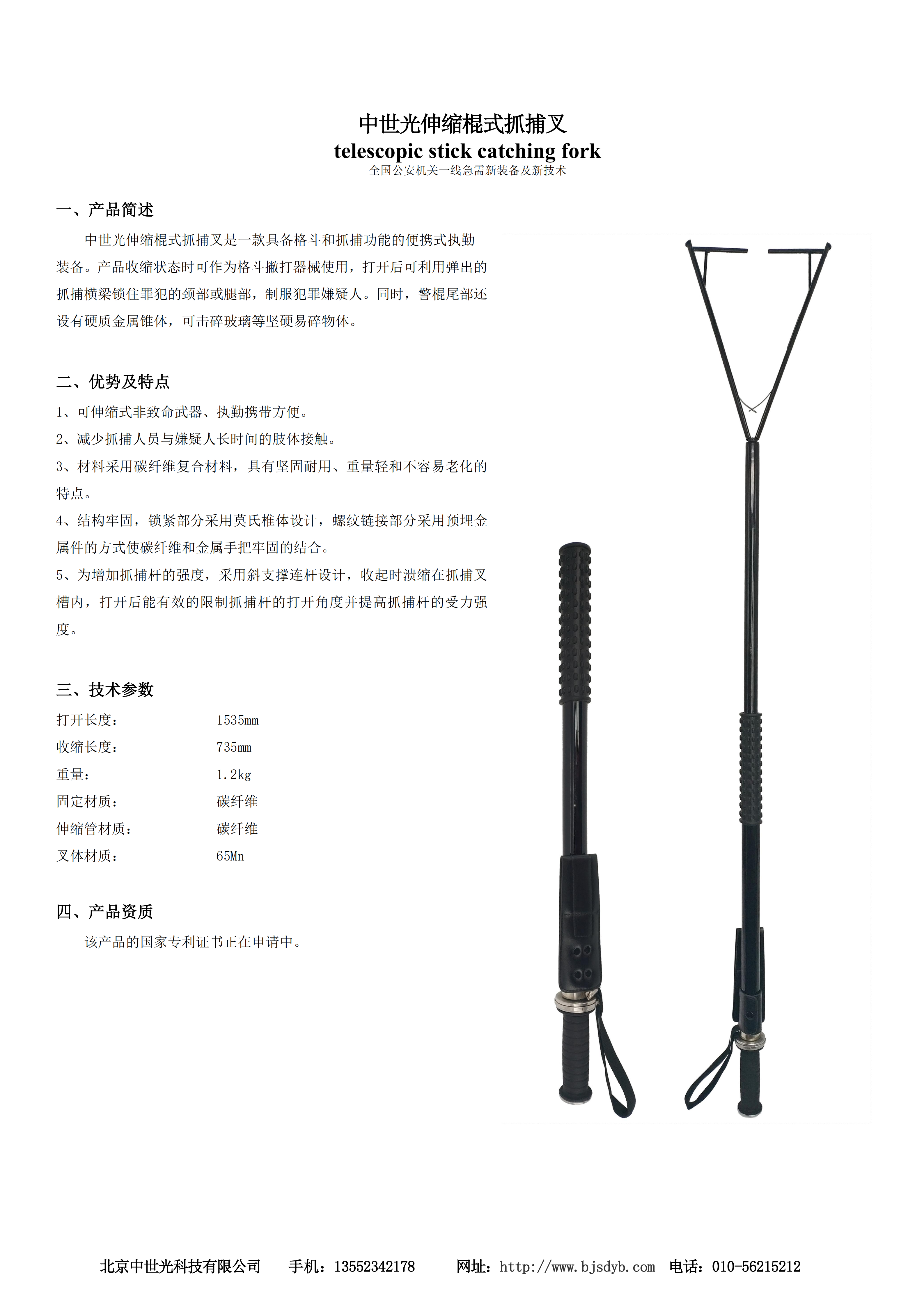中世光伸缩棍式抓捕叉是一款具备格斗和抓捕功能的便携式执勤装备。产品收缩状态时可作为格斗撇打器械使用,打开后可利用弹出的抓捕横梁锁住罪犯的颈部或腿部,制服犯罪嫌疑人。同时,警棍尾部还设有硬质金属锥体,可击碎玻璃等坚硬易碎物体。